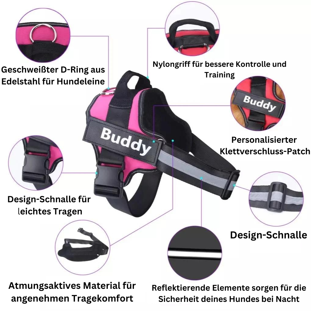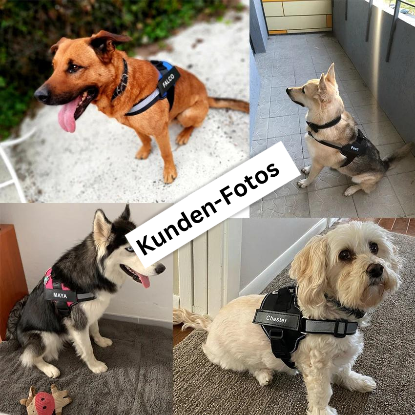 Unser Geschirr ist unkompliziert anzulegen und kann mit dem Namen und der Telefonnummer deines Hundes personalisiert werden. So trägst du nicht nur zur Sicherheit, sondern auch zur Rückkehr deines Lieblings bei, sollte er einmal verloren gehen. Dieser Service ist bereits im Preis enthalten.